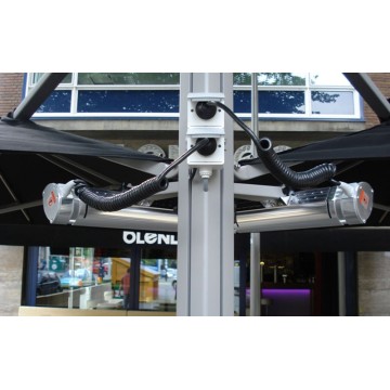 Het voordeel is dat het geheel er esthetisch mooi uitziet en dat u meer loopruimte rond en onder de parasol heeft.