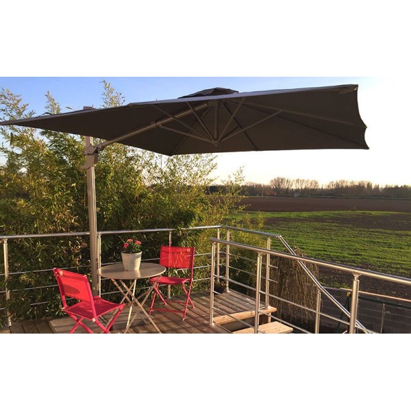 Deze vrijhangende zweefparasol van 260*260 cm is 360 graden draaibaar en is verticaal verstelbaar in verschillende standen, zodat u bijna altijd in de schaduw zit.